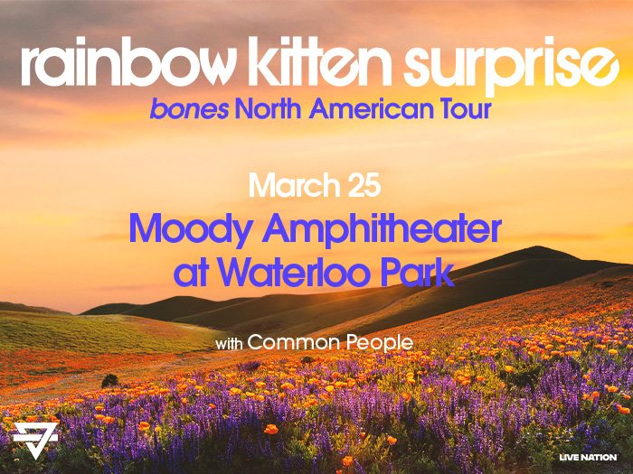 Rainbow Kitten Surprise: bones North American Tour with special guest Common People is headed to Moody Amphitheater at Waterloo Park on Wednesday, March 25, 2026! Tickets go on sale Friday, October 31 at 10 AM at LiveNation.com