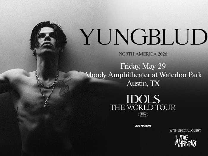 YUNGBLUD: IDOLS – THE WORLD TOUR is headed to Moody Amphitheater at Waterloo Park on Friday, May 29, 2026! Tickets go on sale Wednesday, October 8 at 10 AM at LiveNation.com.