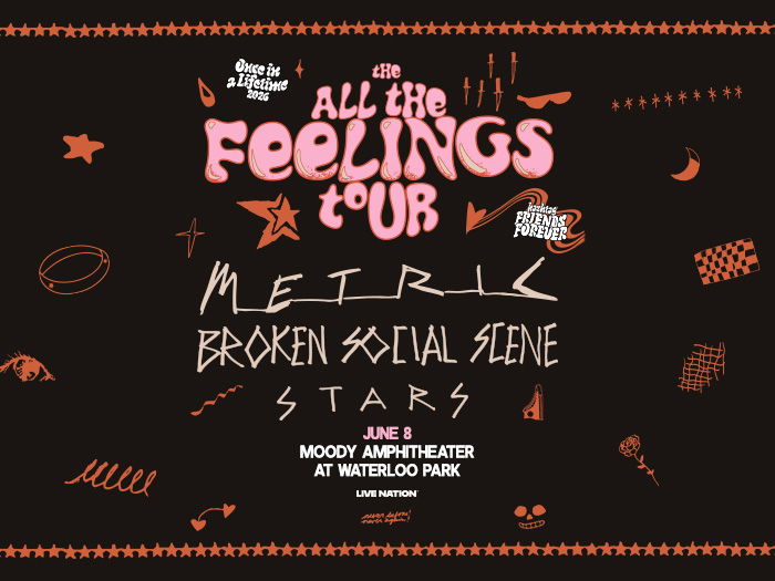 ALL THE FEELINGS TOUR with METRIC, BROKEN SOCIAL SCENE, AND STARS is headed to Moody Amphitheater at Waterloo Park on June 8, 2026! Tickets go on sale Friday, February 6 at 10 AM at LiveNation.com.