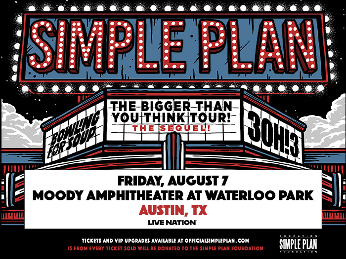 Simple Plan: Bigger Than You Think! Tour – The Sequel! with special guests 3OH!3 and Bowling For Soup are headed to Moody Amphitheater at Waterloo Park on August 7, 2026! Tickets go on sale Friday, February 13 at 10 AM at LiveNation.com.